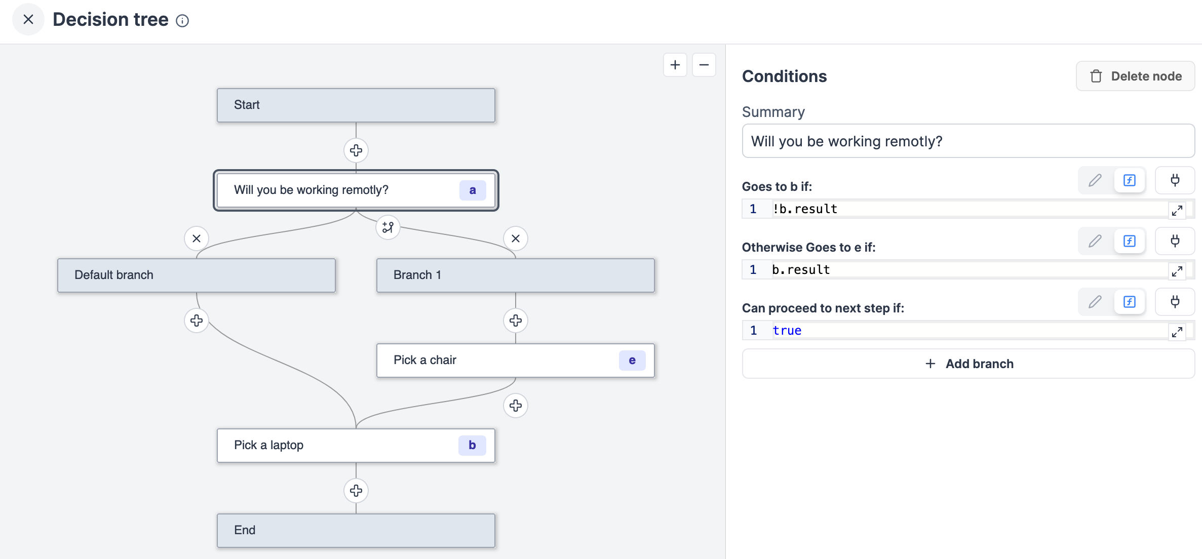 This app component allows you to create a decision tree controlled by a flow-like structure. Each node in the tree represents a decision point with a dedicated subgrid and can lead to one or more subsequent nodes based on specified conditions.