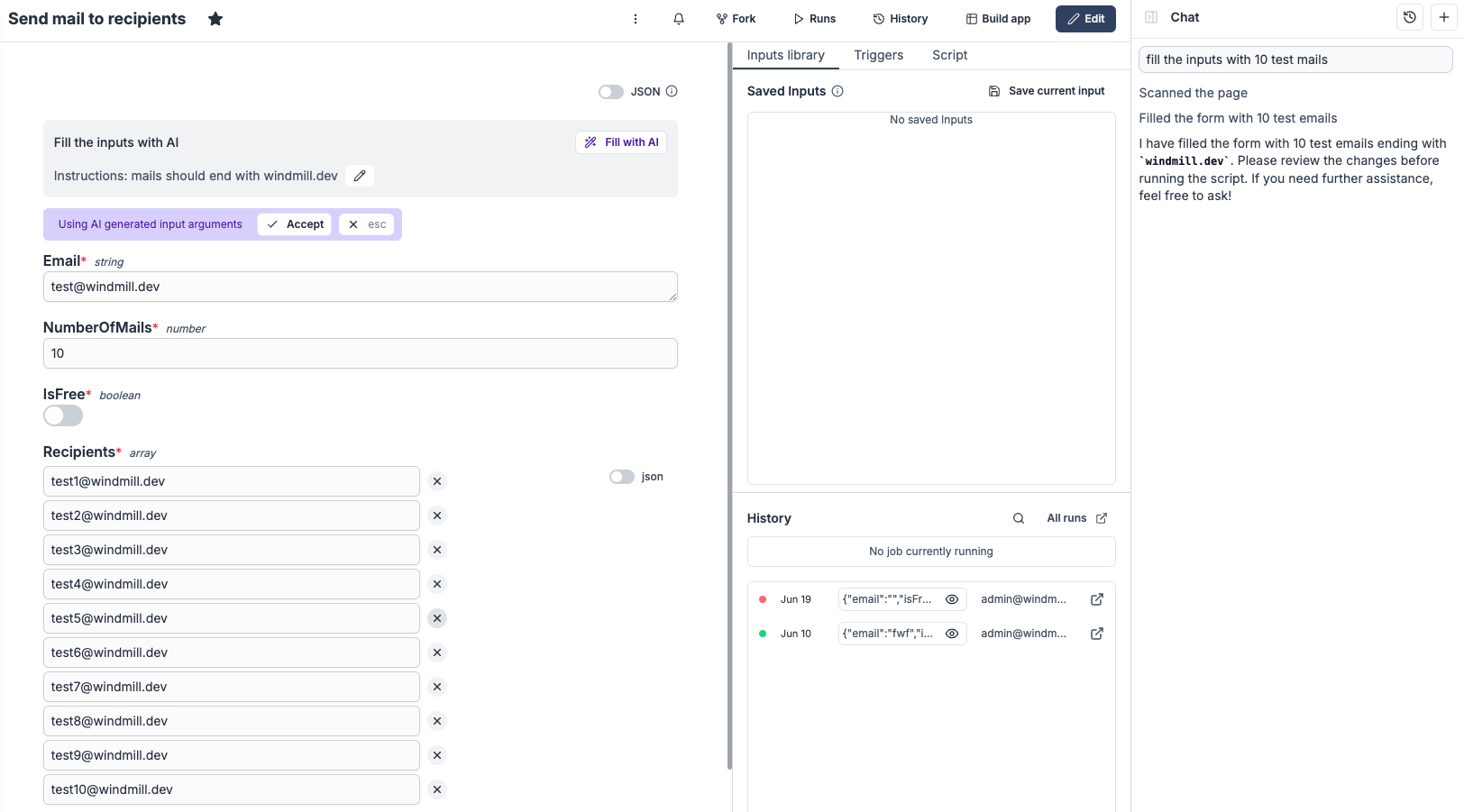 - taskScript() and taskFlow() to dispatch to existing Windmill scripts and flows by path.